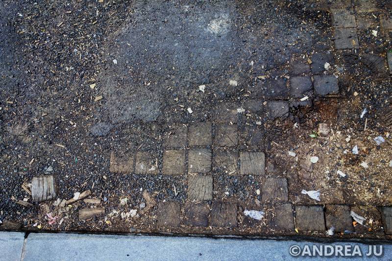 The wooden blocks didn’t only absorb the horse hooves sounds. They soaked up moisture from rain, snow, and especially horse urine. The pine and oak wood block streets were extremely stinky and rotted and crumbled easily. By the time automobiles came around they were mostly gone.