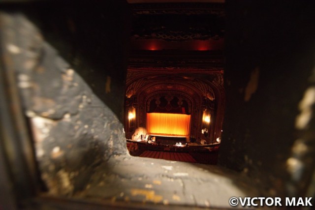 The whitish line you see in the upper right is from a divider. After it’s heyday, the movie theatre was divided up into a few movie screening rooms.