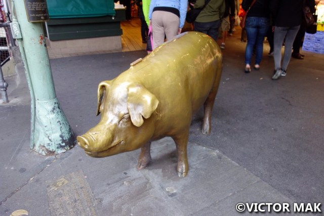 We met Travel Gourmand (TG) at Pike’s Place Market by Rachel the Pig. After introducing ourselves, TG told me she was a bit nervous about how to dress, thinking we’re from NYC, she wasn’t sure if we’d be dressed up. Vic and I hate dressing up, we try to see how much we can get away with dressing down when there’s a formal event. So no one has to be nervous meeting us, we’re laid back.