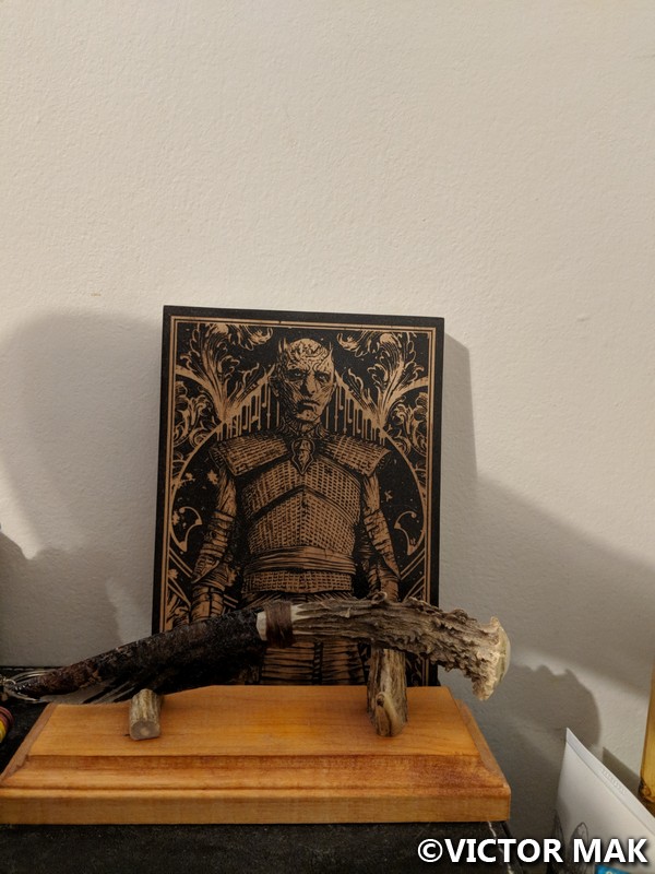Whitewalker from SpaceWolf is a print maker illustrator, woodworker. The obsidian blade is from Pike Place Market and made by Robin Park at Swanfield Horncraft stand.
