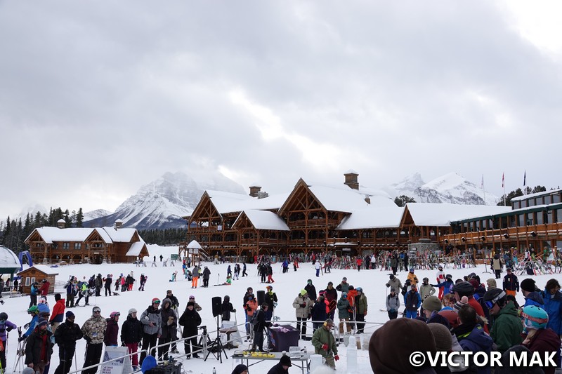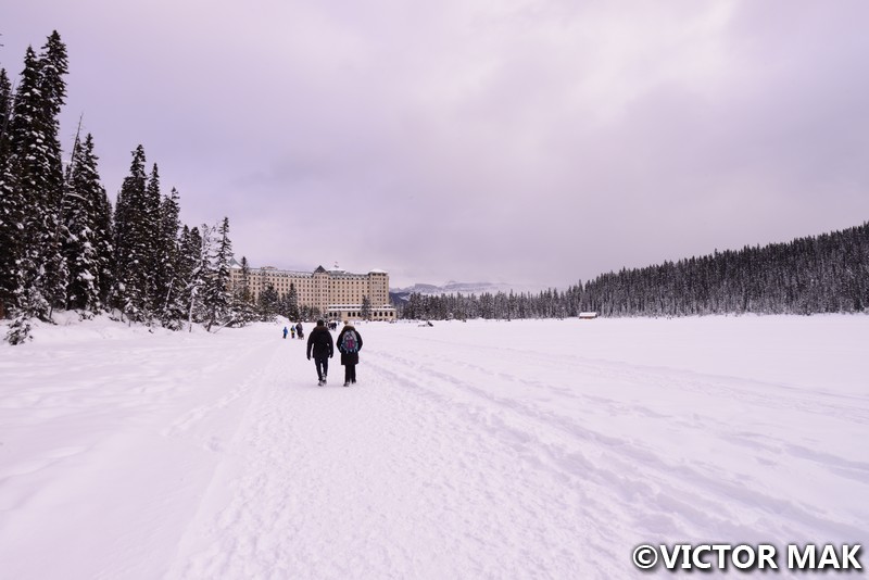 Fairmont hotel in the back ground. People walking on the frozen lake, it doesn’t thaw out till June!